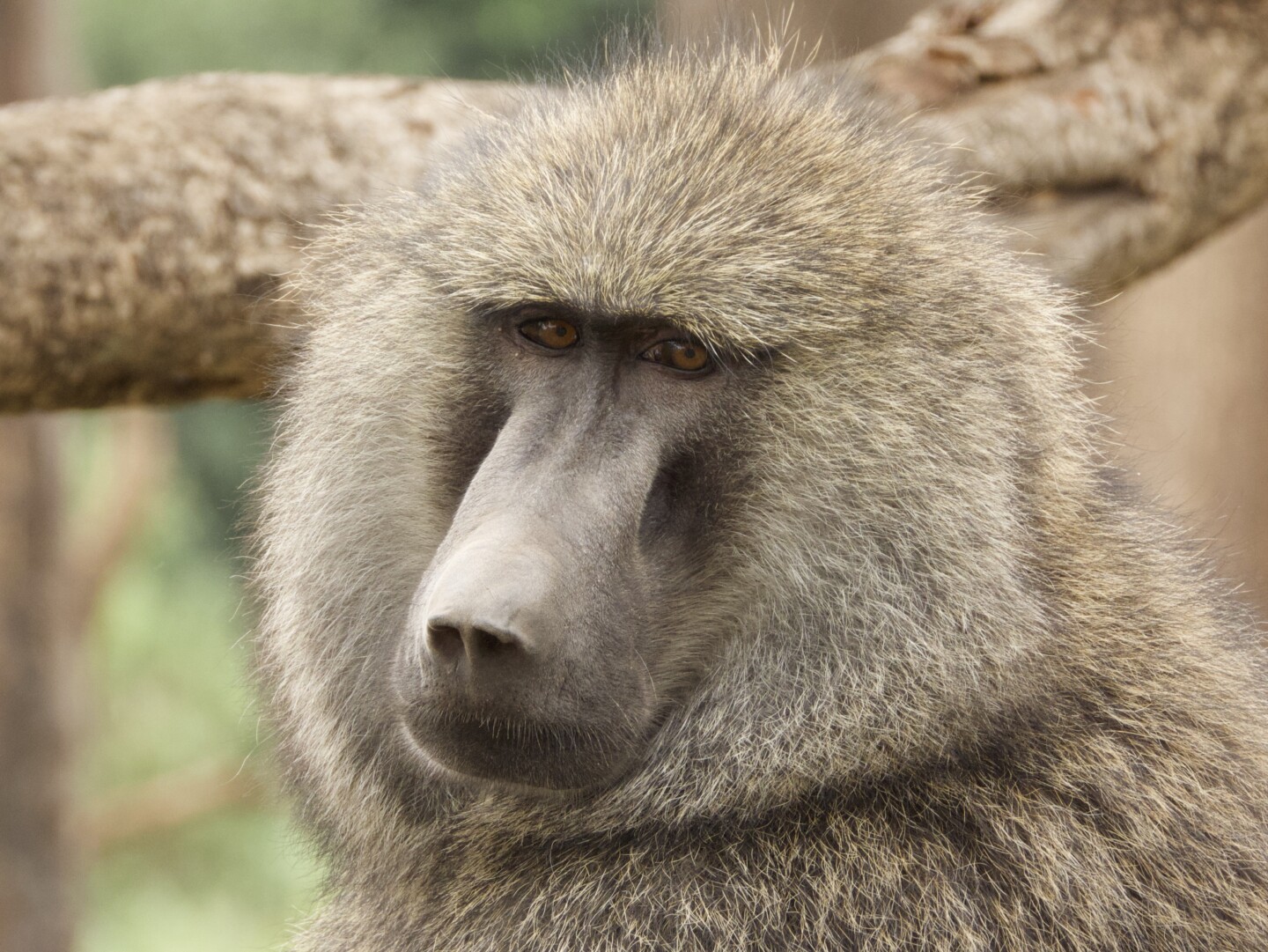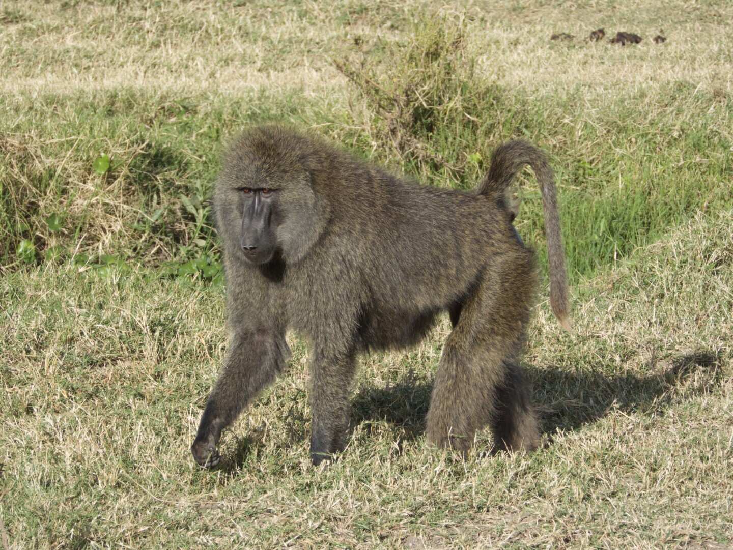 The Olive Baboon (Papio anubis) has a coat that ranges from green-grey to dark olive in color, providing effective camouflage in its savanna and woodland habitats. The fur is multi-layered with yellow-brown and black mixed hairs, and the limbs and tail are usually darker. The face is hairless and dark brown to black, with distinctive ridges above the eyes, and there may be white tufts of hair on the sides of the face, enhancing their expressive features.