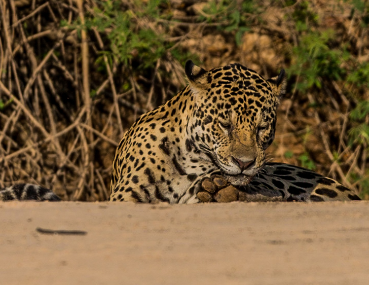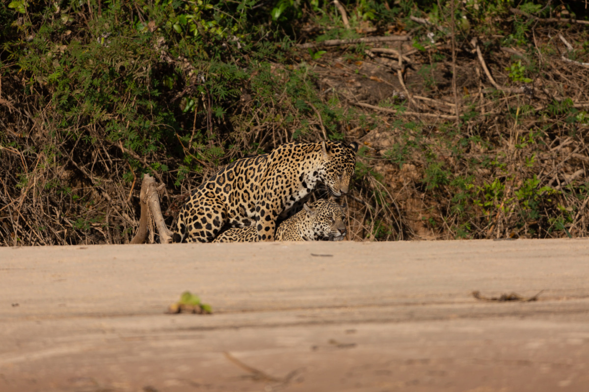 Gracias a los bancos de arena que se forman en las orillas del río es posible ver familias enteras de jaguares en medio de sus actividades normales.